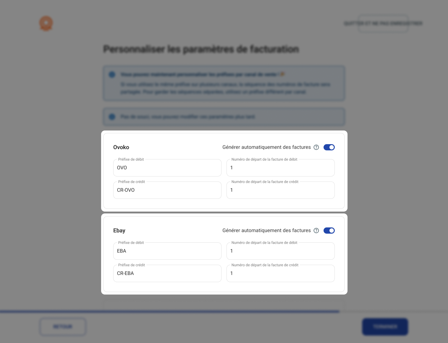 Vous pouvez définir des préfixes uniques (ex. : OVO, EBA, ALG) et des numéros de départ (ex. : à partir de 1) pour chaque canal de vente.