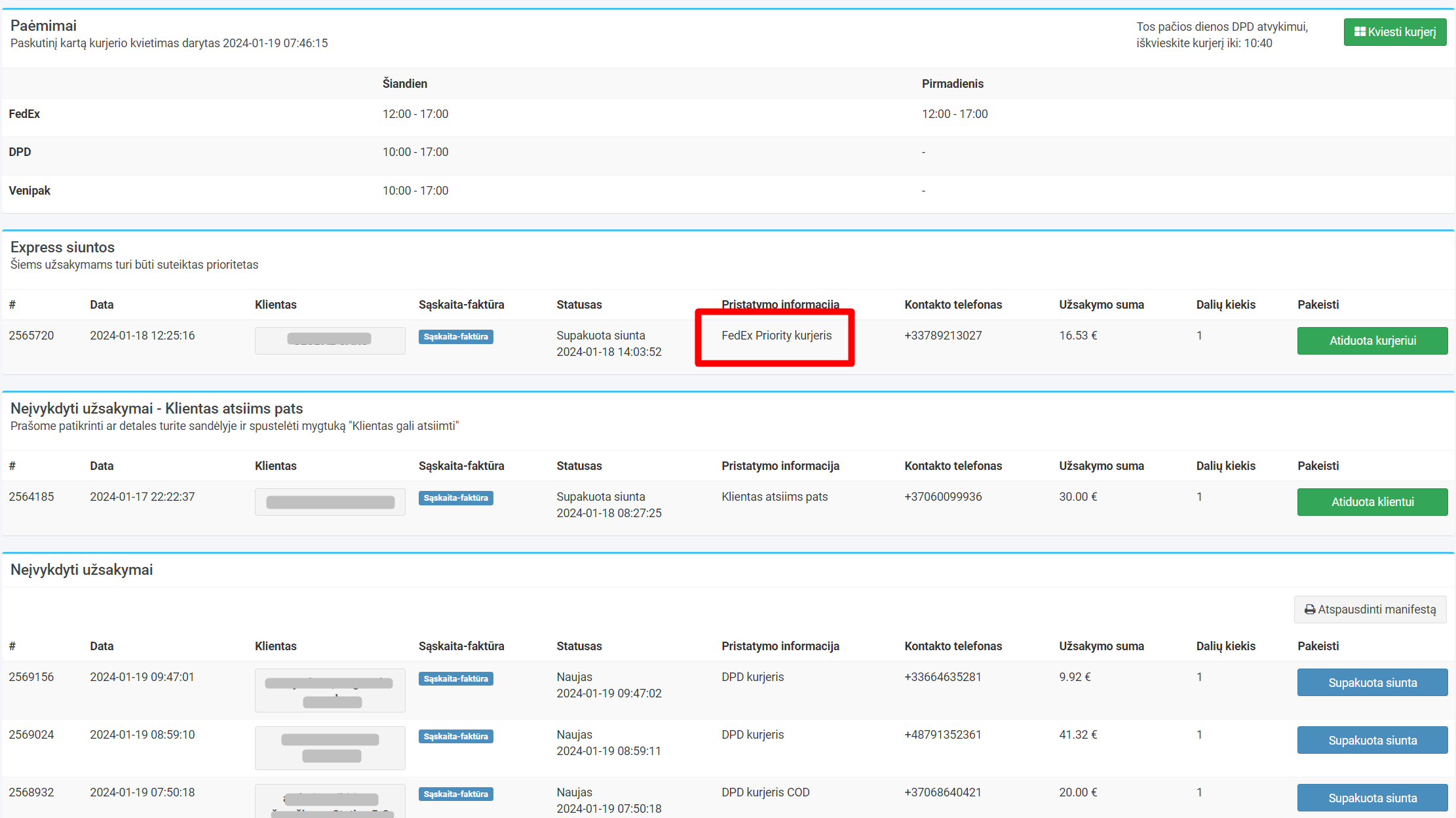 Fedex priority siuntos keliauja lėktuvais tad prašome siuntas būtinai pakuoti tvarkingai į dėžutes, jokiu būdu nepakuokite prekių į tūtas ar tiesiog susuktas į plėvelę. Gavus Fedex priority užsakymą prašome jį paruošti pirmenybės tvarka, jį išvysite neįvykdytų užsakymų skilties viršuje.