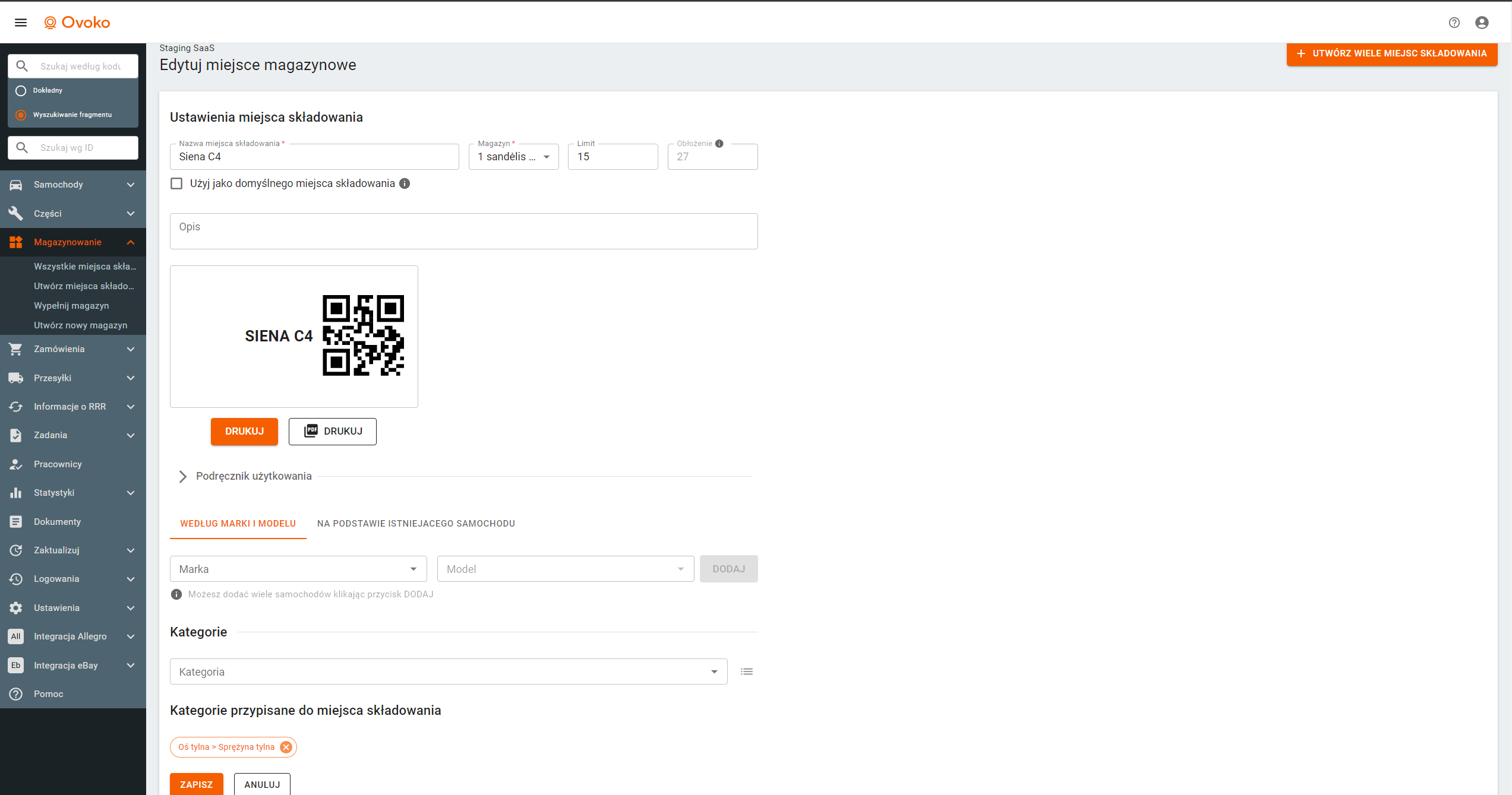Gdy klikniesz "Utwórz nowe miejsce składowania" lub edytujesz to które było utworzone wcześniej, zobaczysz nowy wygląd, który również powinien ułatwić Ci pracę. Na ekranie zobaczysz samochody i kategorie przypisane do tej lokalizacji. Zarządzanie magazynem powinno być znacznie bardziej przejrzysta niż w starej wersji.