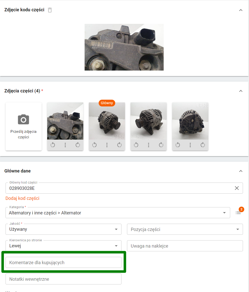 - Dodawaj przejrzyste opisy - im więcej szczegółów dotyczących oferowanej części tym lepiej. Podaj szczegóły dotyczące cech produktu, jego stanu i ewentualne wady. Jeśli sprzedajesz części karoserii, nie zapomnij podać kodu koloru. Jeśli sprzedajesz części po testach (takie jak np. wtryskiwacze) dołącz zdjęcie dokumentu testowego i zaznacz to w opisie.