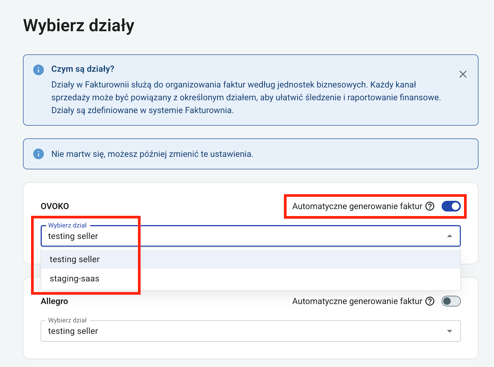 - Dla każdego kanału sprzedaży (np. OVOKO, Allegro) wybierz dział, z którym chcesz go połączyć, z listy rozwijanej.