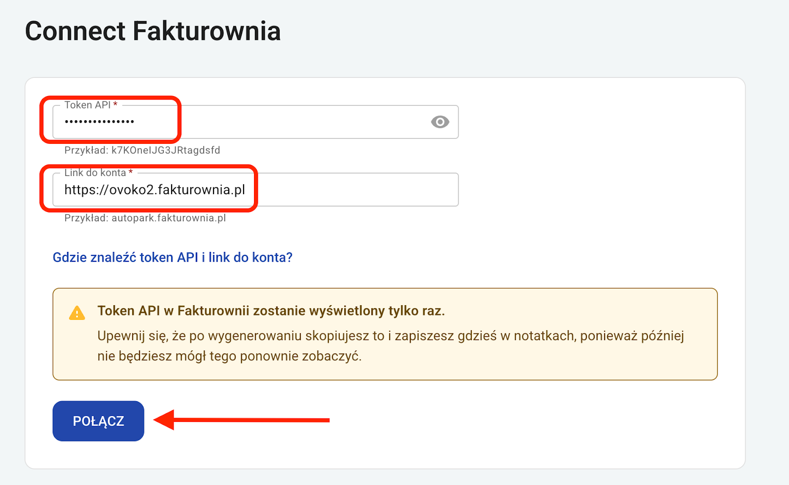 Aby połączyć swoje konto Fakturownia, musisz podać aktualne dane na naszej stronie ustawień. Możesz znaleźć te dane logując się do swojego konta Fakturownia.pl.