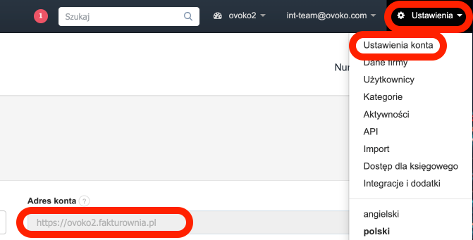 - Na stronie "Twoje konto" znajdź pole Adres konta. Adres URL w tym polu (np. https://ovoko2.fakturownia.pl) to Twój "Link do konta". Skopiuj go.