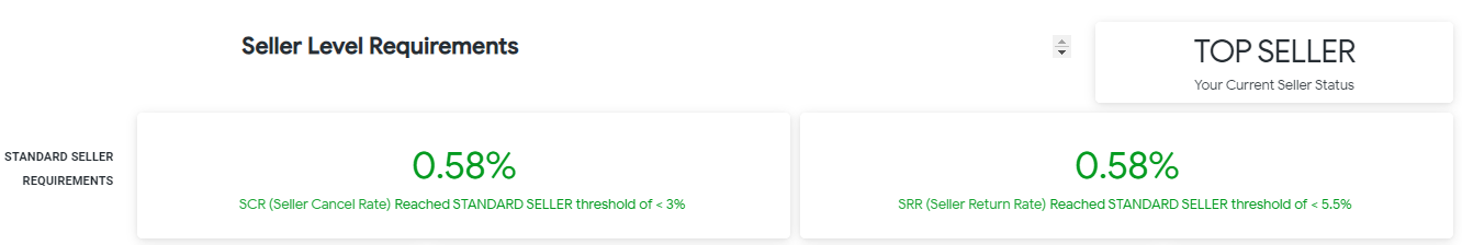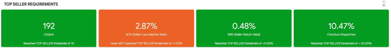 A doua secțiune indică dacă vânzătorul a îndeplinit cerințele programului Top Seller. Pentru a participa la program, toate cerințele trebuie să aibă fundal verde. Dacă fundalul este portocaliu, înseamnă că cerința nu a fost îndeplinită.