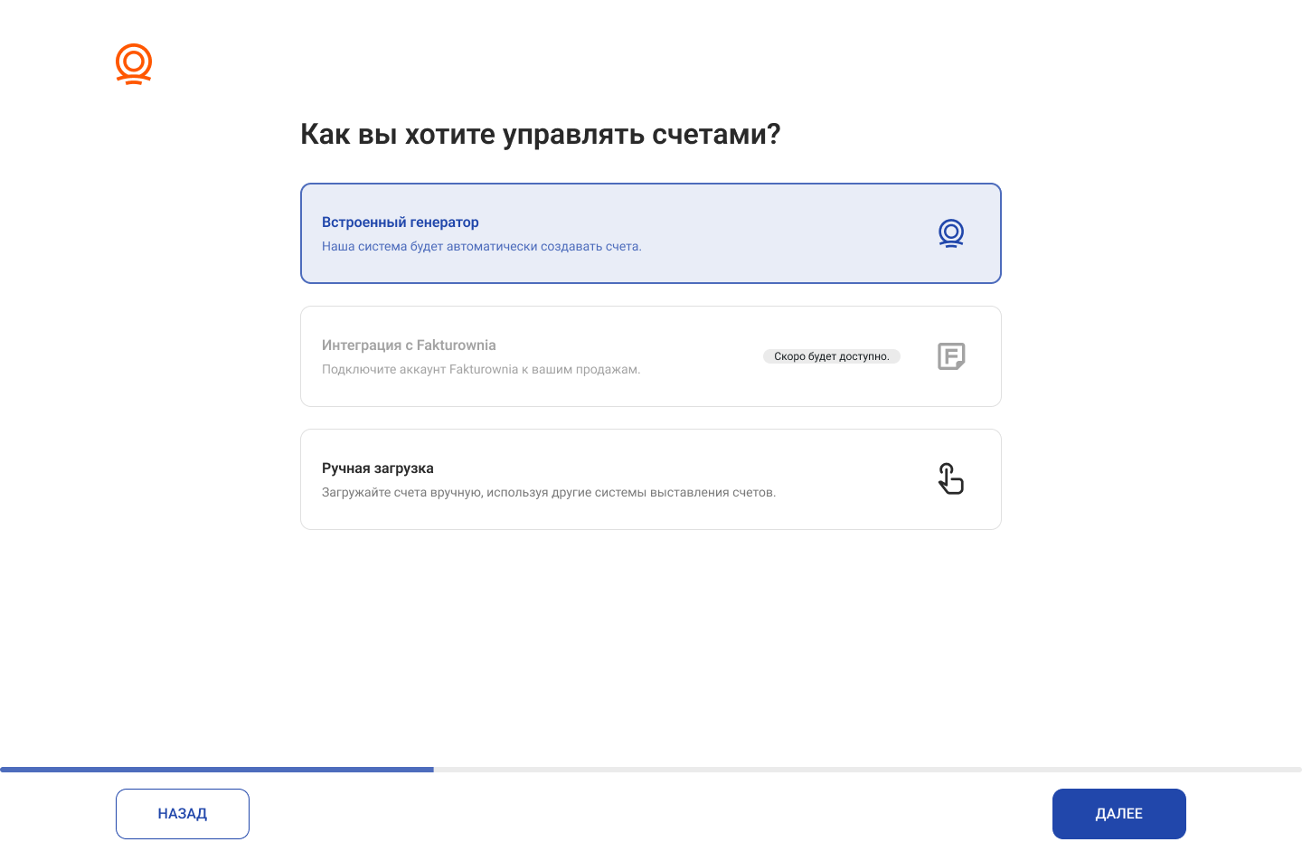 - Отключено (OFF) → счета не создаются автоматически; в этом случае их нужно будет загружать вручную.