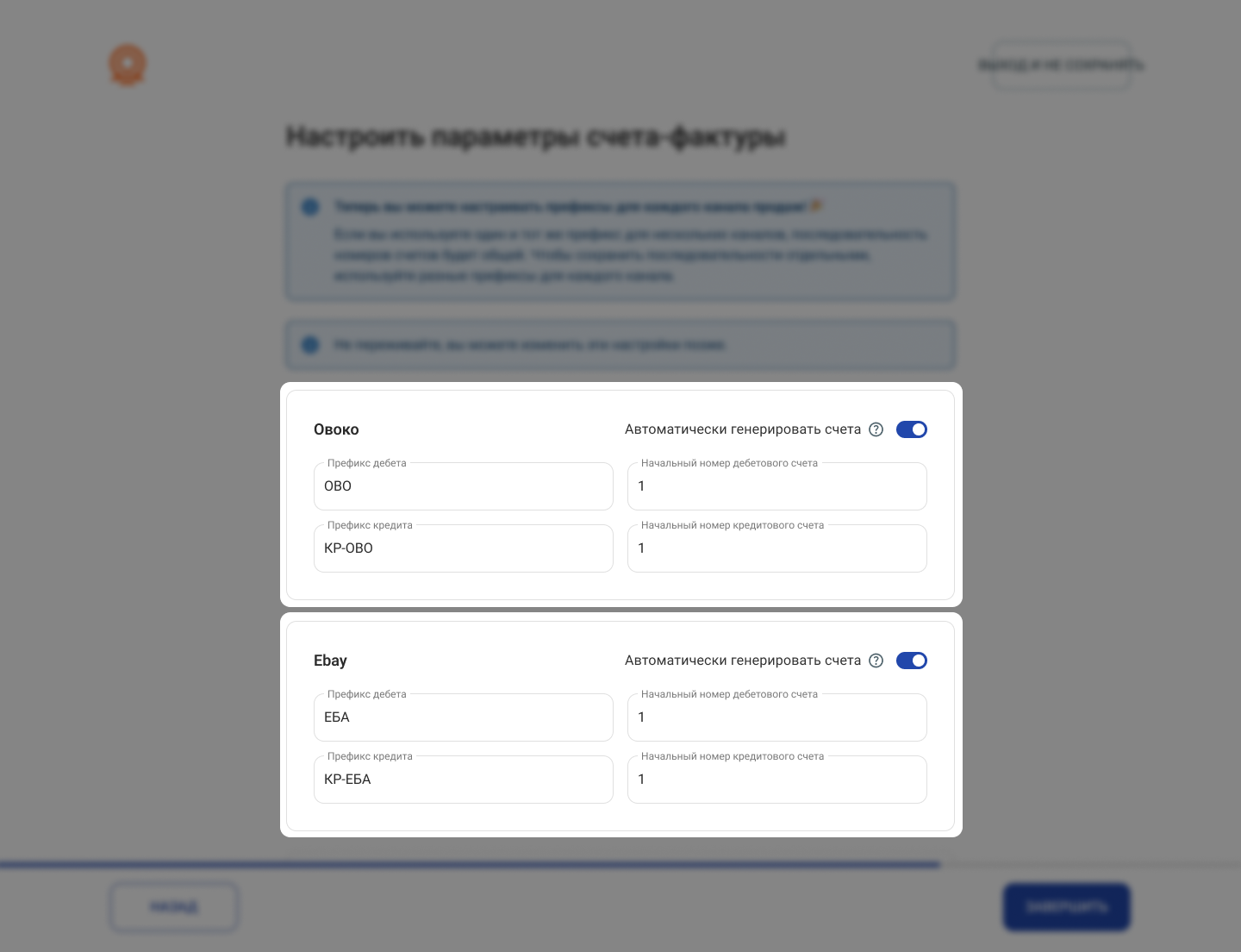 - Настройте префиксы, начальные номера и правила автоматической генерации для каждого канала продаж.