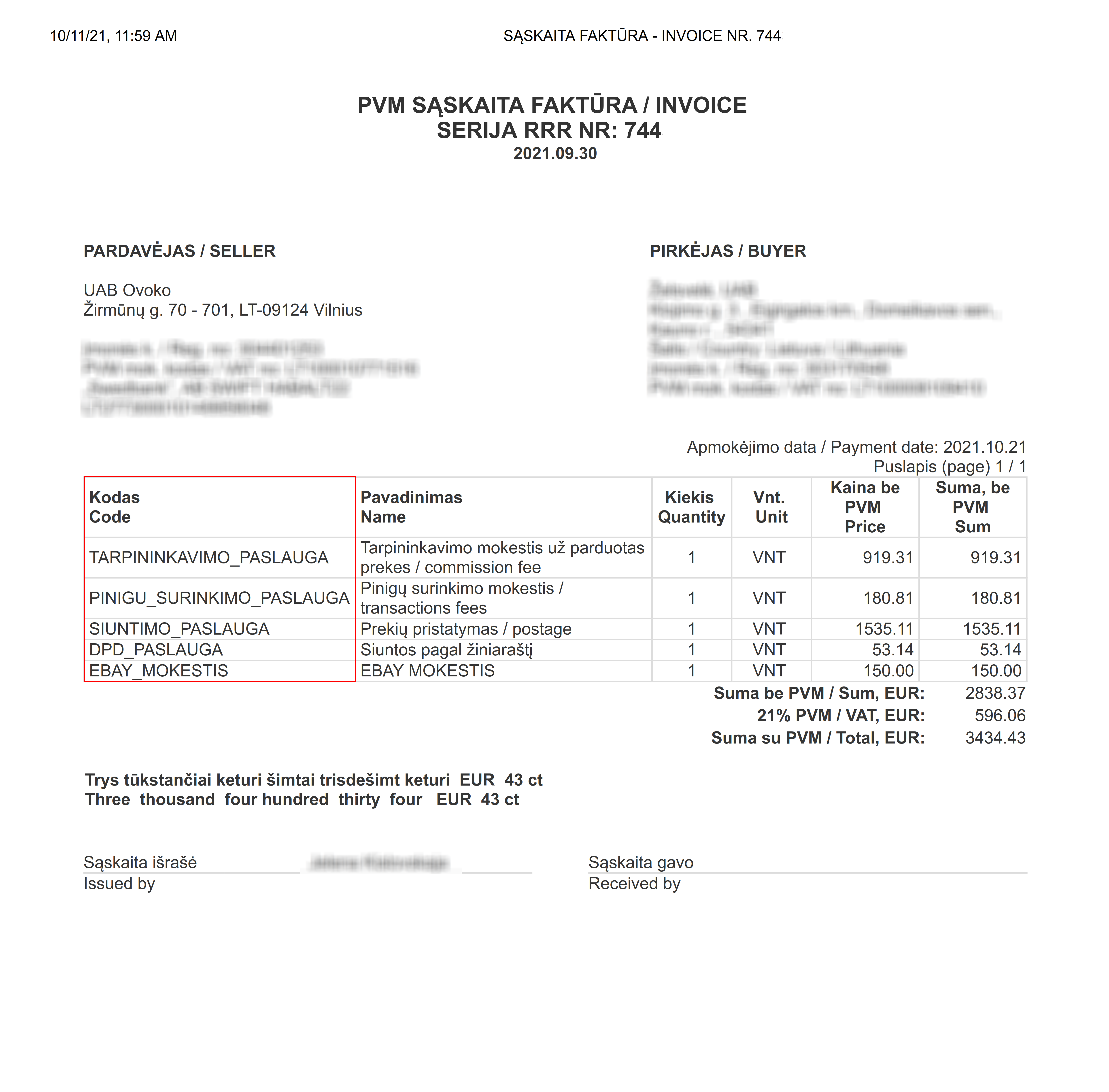 "Почтовые расходы" 69.27+137.16+11.17= 217.6 Eur, так как вы не являетесь плательщиком НДС, НДС вычитается до внесения суммы в счет-фактуру, чтобы вы не платили дважды. (217.6 X 21 / 121 = 37.76 (Сумма вычета НДС) 217.6 - 37.76 = 179.83 Eur